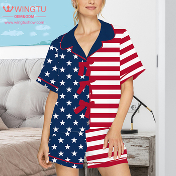 WingTu 사용자 정의 여성 여름 4 일 7 월 독립 기념일 패션 프린트 셔츠 반바지 나비 잠옷 세트 포켓